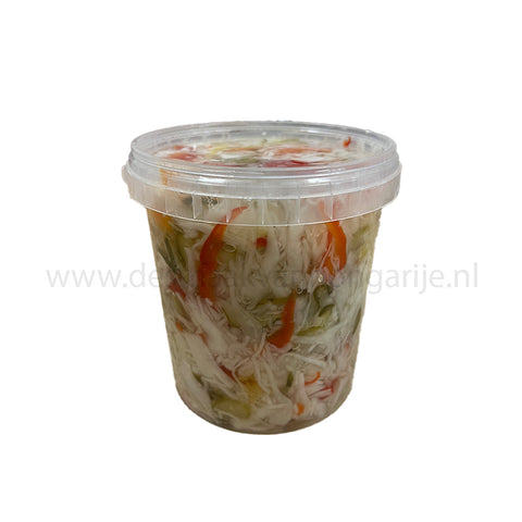 Kool, augurk, paprika, water, zout, voedingszuur: azijnzuur, conserveermiddel: natriumbenzoaat, antioxidant: kaliummetabisulfiet, zoetstof: natrium-saccharine, kruidenaroma.